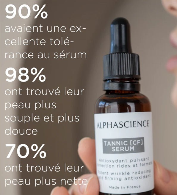 Grâce à sa haute concentration en vitamine C sous sa forme naturelle, l’acide L-ascorbic, le TANNIC [CF] SERUM d’Alphascience devient un puissant antioxydant. Il relance la synthèse du collagène, prévient la formation des taches et redonne de l’éclat.