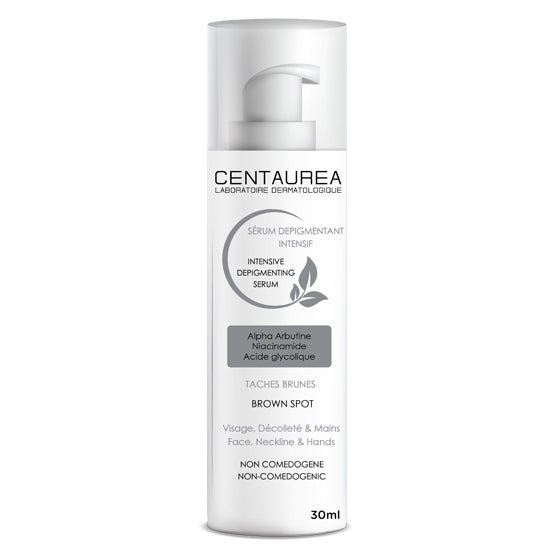 Le sérum dépigmentant intensif Centaurea est un soin apportant une solution pour la prise en charge des taches brunes et de l’hyperpigmentation cutanée, notamment dans les cas suivants : Mélasma (masque de grossesse), dyschromie (tâches de vieillesse), lentigo solaire, marques cicatricielles post-inflammatoires (acné,…..). Grâce à l’Alpha Arbutine, la Niacinamide et l’acide glycolique, le sérum dépigmentant Centaurea a une action complète sur : -la dépigmentation des taches brunes -le renouvellement cellulaire -la diminution de production de mélanine. La présence de la vitamine E allantoïne permet également de bien hydrater la peau pour compléter l’action dépigmentante. Convient à tous les types de peaux Peut s’utiliser toute l’année.