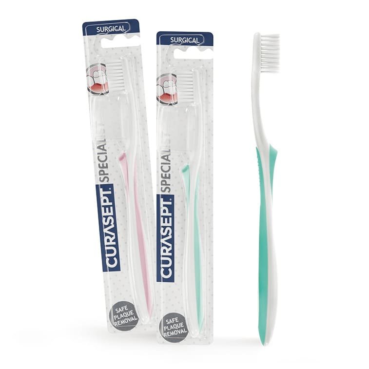 Après intervention, en cas d’inflammations et de radiothérapies buccales. Développée en collaboration avec l’université de Berne. 12000 filaments d’un diamètre de 0,06 mm.Curasept Brosse à dent Specialist Surgical