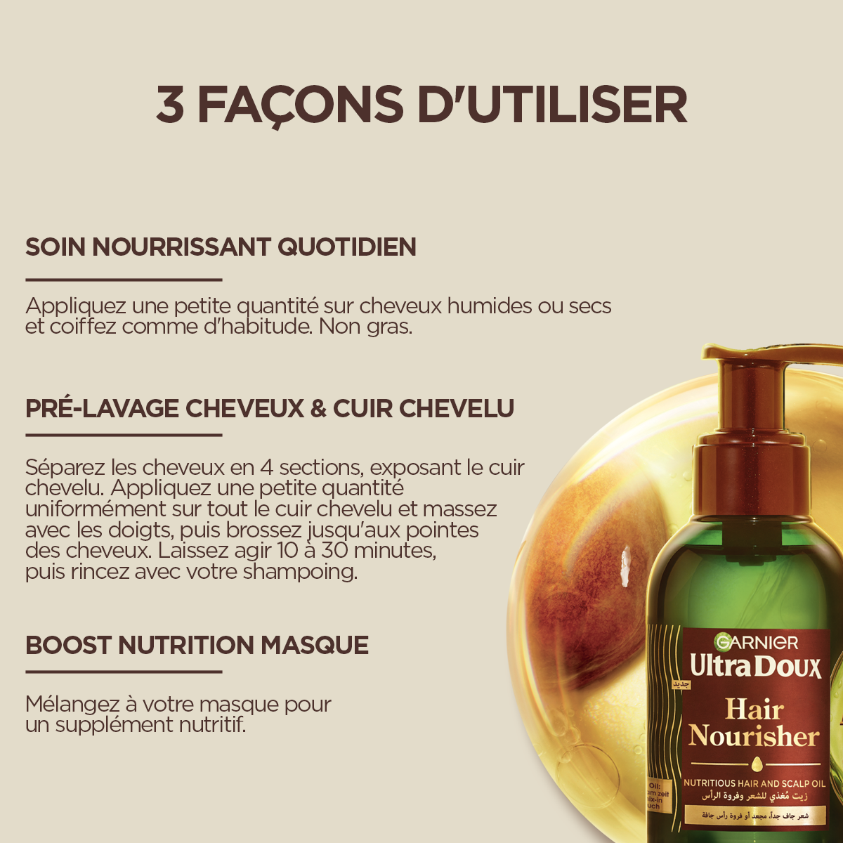 L’huile nourrissante pour cheveux Garnier Ultra Doux est conçue pour nourrir intensément et hydrater les cheveux et le cuir chevelu. Enrichie en huile d’avocat ultra-concentrée et en beurre de karité, elle contient 1000 nutriments par goutte pour une nutrition 2 fois plus intense. Sa formule non grasse contrôle les frisures pendant 96 heures et offre une fragrance longue durée de 48 heures. Convient à tous types de cheveux, elle peut être utilisée de 3 façons : en soin quotidien sans rinçage, en masque pré-shampooing ou mélangée à un masque capillaire. Légère et efficace, elle est douce pour toute la famille et laisse les cheveux doux, nourris et éclatants de santé.