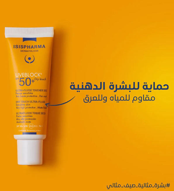 Protégez efficacement votre peau sensible du soleil grâce au soin solaire UVEBLOCK® SPF 50 Dry touch à la texture ultra-fluide et matifiante !