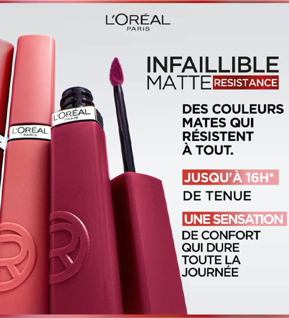 Rouge à lèvres mat nourrissant qui résiste à tout : Infaillible Matte Resistance de L’Oréal Paris donne aux lèvres une couleur éclatante et un fini mat intense pour une tenue jusqu’à 16 heures.