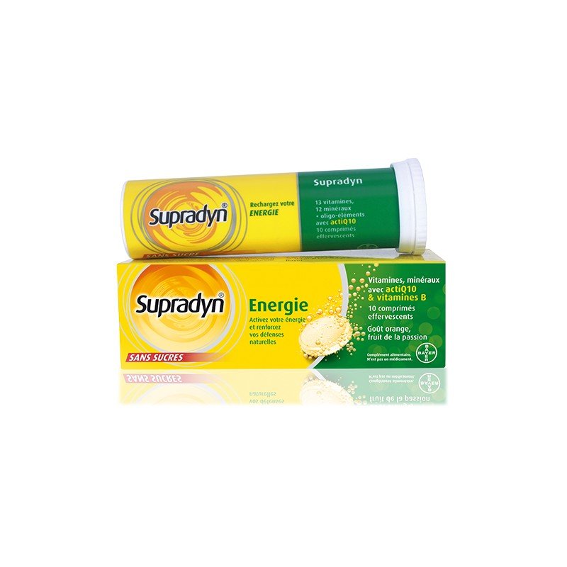 SUPRADYN ENERGY 10 COMPRIMES EFFERVESCENTS est une formule multivitaminée sans sucre pour les adultes et les adolescents à partir de 12 ans. La combinaison de 13 vitamines , 12 minéraux ainsi que la Coenzyme Q10 assurent à l’organisme un apport optimal en micronutriments et aident à prévenir les carences en vitamines ou à y remédier . En période de fortes sollicitations , ainsi qu’en cas de fatigue et d’épuisement , Supradyn® Energie stimule et renforce.